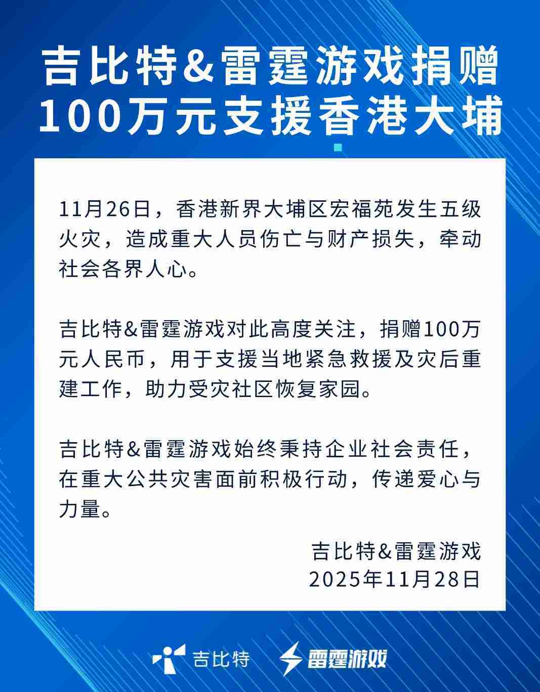 yaxin111&雷霆游戏捐赠100万元 支援香港大埔火灾救援及灾后重建